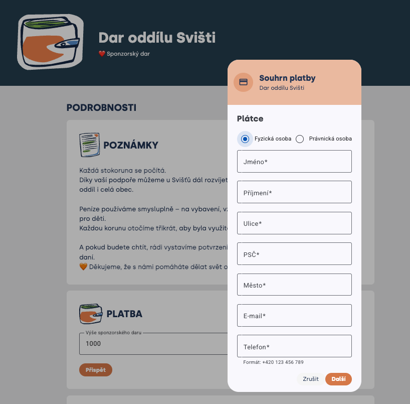 Po vyplnění částky se dárci zobrazí pole pro zadání údajů (které se propisují do potvrzení o zaplacení), lze vybrat také právnickou osobu (firmy):