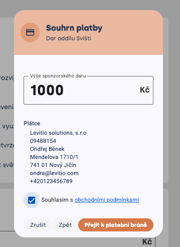 Zvolíte-li typ platby s možností daru, uvidí rodič při placení v Levitiu před přesměrováním na platební bránu možnost zvýšit platbu a podpořit tak oddíl. Přednastavená možnost je 0Kč (nenavýšení) a následují dvě připravené možnosti a jedna vlastní, kde může rodič částku libovolně nastavit.