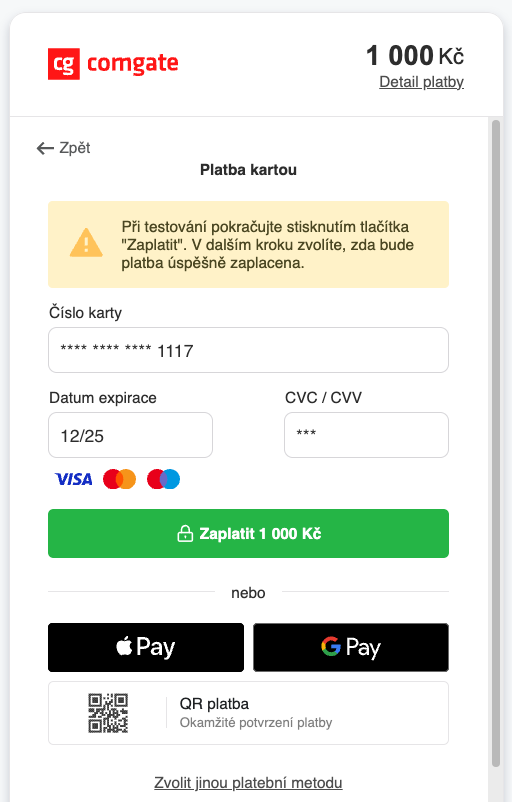 Nadále systém funguje jako u běžné platby, tj. dojde k přesměrování na platební bránu, kde si dárce vybere platební metodu a zaplatí.