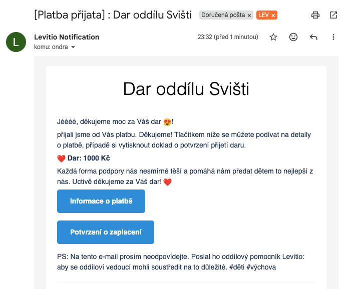 Oddílu po kliknutí na Vyúčtovat přijde potvrzující e-mail o zpracovávání vyúčtování a ihned po zpracování transakce mu přijde e-mail s účetním dokladem, ve kterém jsou souhrnně zvlášť rozepsány přijaté platby, dary a poplatky Levitiu. Na dalších stranách souhrnu jsou rozepsány všechny platby jednotlivě.