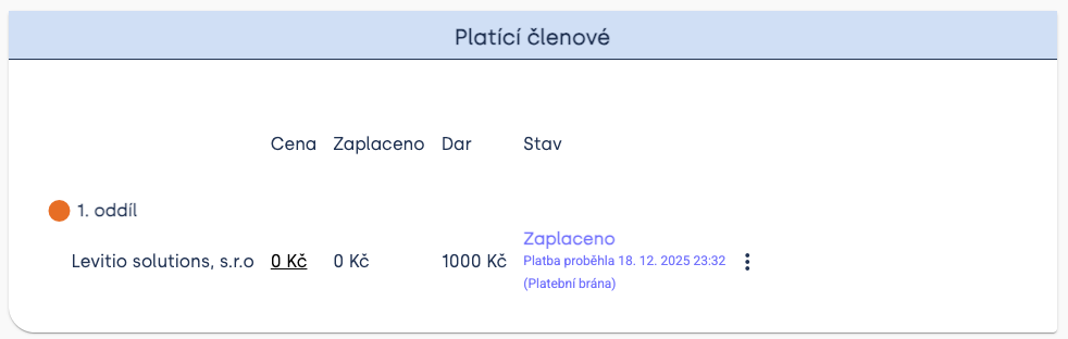 V administraci plateb pak jde vidět souhrn darů zvlásť. Jakmile se oddíl rozhodně vyúčtovat platby (= zadat pokyn k odeslání financí z Levitia na oddílový účet), tak oddílu přijdou dvě samostatné platby – všechny platby v rámci dané skupiny plateb v jedné platbě a všechny dary dohromady zvlášť.