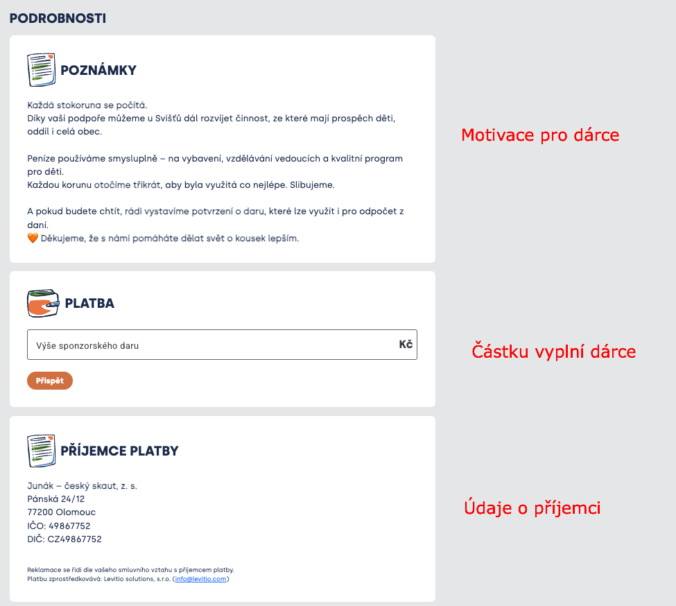Odkaz vede na stránku k polatbe, která zobrazuje poznámky (tebou vymyšlené text motivující dárce), políčko pro vyplnění výše platby a identifikaci příjemce (tvou organizaci/oddíl).